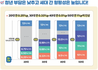 그래서 우리 20대 자녀는 2040년까지 보험료율 13%에 도달하게 된다는 거예요. 단기적으로는 덜 내는 것 같지만, 장기적으로는 더 오랫동안 납부해야 하니까 청년들이 느낄 부담은 엄청나죠.